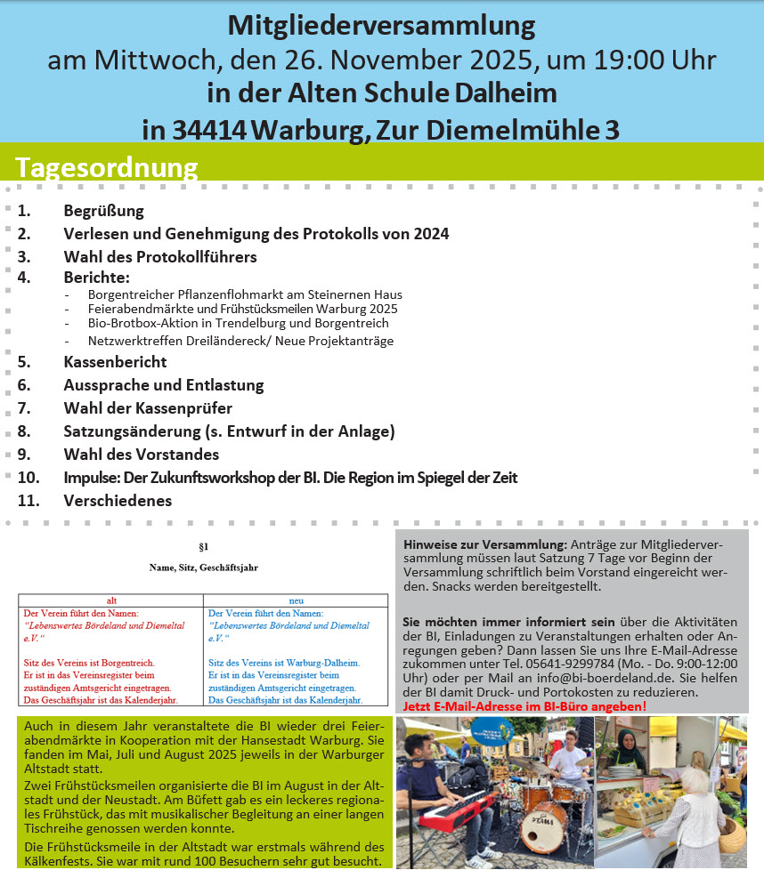 Die Mitgliederversammlung der Bürgerinitiative Lebenswertes Bördeland und Diemeltal fand am 26. November in der Alten Schule in Dalheim statt. Auf der Tagesordnung stand diesmal die Neuwahl des Vorstandes.