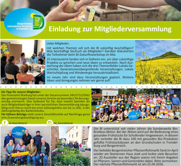 Die Bürgerinitiative Lebenswertes Bördeland und Diemeltal lädt ihre Mitglieder am Mittwoch, den 26. November 2025, zur Jahreshauptversammlung nach Warburg-Dalheim ein. Beginn der Versammlung in der Alten Schule, Zur Diemelmühle 3, ist um 19:00 Uhr.